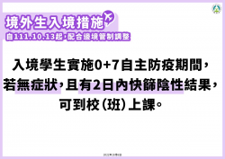 為邁向防疫正常生活,並配合中央流行疫情指揮中心自10月13日邊境管制放寬,有關境外生入境自111年10月13日零時(航班表定抵臺時間)起,境外生免除居家檢疫,改進行7天自主防疫。 10/13起,入境生0+7自主防疫期間,若無症狀,且有2日快篩陰性結果,可到校上課。圖:教育部提供 教育部說明,入境名冊免報教育部核定,學生憑入學通知單直接向外交領事事務局及內政...... [閱讀更多]