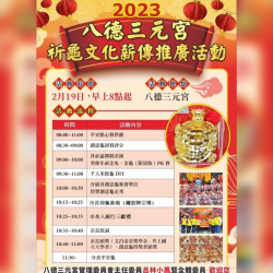 具有二百多年歷史的八德三元宮,是八德地方信仰中心,每年農曆二月初二土地公誕辰時舉辦之祈龜活動傳承已久,為在地民俗盛典。「2023八德祈龜文化薪傳推廣活動」由八德三元宮及八德區公所結合辦理,將於2月18日至2月22日熱鬧展開,2月18日晚間起開放信眾擲筊祈龜;2月19日活動重頭戲登場,當天除傳統祈龜外,還有市長敬獻大型米糕龜、創意龜競賽及千人DIY米糕龜競賽等一系列精彩內容;另規劃2月2...... [閱讀更多]