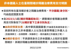 中央流行疫情指揮中心表示,自2023年1月1日起,不具健保身分之非本國籍人士在臺期間如確診COVID-19,其隔離治療費用須由確診者自付。 不具健保身分之外籍人士在臺確診,元旦起需自付治療費用。圖:指揮中心提供 指揮中心說明,目前入境旅客人數穩定成長,將自2023年1月1日隔離起始日起,調整COVID-19確診者隔離治療費用支付原則,凡具中華民國國籍者(不...... [閱讀更多]