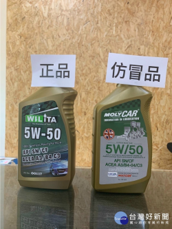 圖中左側產品為台久公司出品的「WILITA威力特」機油包裝。右側產品為華盛頓鉬元素公司仿冒的「MOLYCAR」機油包裝。(記者陳榮昌攝) 台中廣播名人以「國產油誆英進口機油」銷售遭判刑,遭牽累的台久公司總經理陳宗賢發出聲明指出,「華盛頓鉬元素」總經理陳瀚強銷售兩個品牌機油,「Molycar機油」為陳瀚強私下找其他工廠仿冒英國品牌,與台久並無...... [閱讀更多]