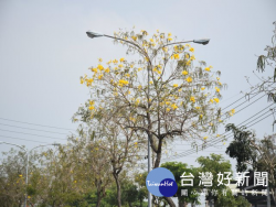 后里三豐路中央分隔島黃花風鈴木盛開 黃綠相映美不勝收