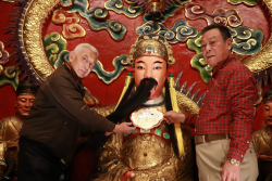 昨(15)日桃園大廟景福宮清屯,企業家陳章喜帶著約莫「四兩」的大金牌來到廟內,在大廟主委簡征潭協助下,等候廟方將聖王公的神衣取下、完成神尊清理工作,陳章喜進到神房為聖王公掛上金牌,神人同喜。 企業家陳章喜(右) 為聖王公掛上金牌。圖:陳毅攝。 簡征潭說,在去年(2022年)年初就收到陳章喜董事長要捐獻金牌的消息,但因為聖王公身上還有神衣,不好掛上金牌,便約...... [閱讀更多]