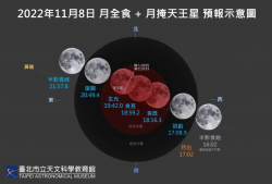 今(8)日的月全食是台灣睽違三年以來本影食全程可見的月全食,自傍晚17時8分起將可全程欣賞月球邊緣出現缺角至完全轉為暗紅色的「血月」奇景,全程歷時3小時40分。 月全食掩天王星預報。示意圖:翻攝自台北市立天文館 台北市立天文館表示,在月全食期間,還將發生罕見的月掩天王星事件,由於月掩星發生有其地域性,在台灣要能夠看到「月全食發生時同時月掩行星」的事件極為罕...... [閱讀更多]