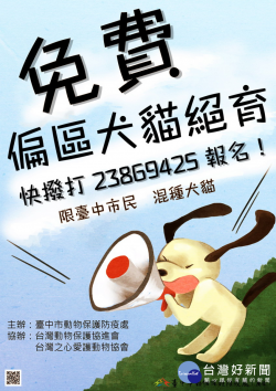 為落實犬貓源頭管理,台中市動物保護防疫處7月將與動保團體及獸醫師合作,至大里、潭子、和平等地區辦理犬貓絕育、寵物登記及狂犬病疫苗注射3合1活動,凡設籍台中市且年滿20歲的市民均可免費報名參加。 7月份場次排定7月8日在大里區健民里活動中心,7月9日在潭子區嘉仁社區活動中心,7月29日在和平區松鶴社區活動中心,其他地區則視報名狀況陸續安排,只要同一地區犬貓...... [閱讀更多]