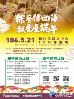 台中市政府推動台中作為國際友善城市,民政局將於5月21日於南屯區新住民藝文中心前廣場,舉辦一場新住民包粽子比賽,即日起優先開放居住或設籍台中市的新住民家庭參加,歡迎踴躍報名。 民政局表示,「粽藝傳四海‧飄香慶端午」活動希望讓新住民瞭解台灣的風俗民情及傳統節慶,活動將安排新住民體驗包肉粽,名額預計100隊,額滿為止;隨行國小(含)以下子女,可參加親子著色比...... [閱讀更多]