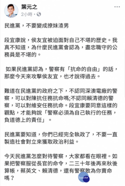 前市府副發言人新北市議員參選人葉元之臉書。(圖/記者黃村杉翻攝) 針對段宜康立委19日說,國民黨新北市長參選人侯友宜現在被迫面對自己不堪的歷史,前市府副發言人新北市議員參選人葉元之反質疑,為什麼民進黨會認為盡忠職守的公務員是不堪的,難道在民進黨的政府執政下,「警察有抗命的自由」? 葉元之說,不認同深澳發電廠的警察,可以對陳抗任務抗命嗎?不...... [閱讀更多]