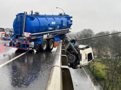 新屋區台61線南下47K處高架橋,5日清晨一輛聯結油罐車由北往南方向行駛高架道路,因不明原因擦撞路肩護欄,導致車輛懸掛於高架橋上,整個車頭衝出護欄掉落,駕駛男子墜落台61線新屋區濱海路永安段555巷平面道路重傷駕駛許男送醫不治,該化學槽車為空車無滲漏情事,現場警方進行交通管制等待拖吊中,未造成車輛回堵,事故發生詳細原因尚待警方調查釐清。 新屋區台61線南下47K處高...... [閱讀更多]