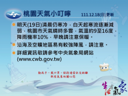 中央氣象局今(19)日表示,今日上午受寒流影響,各地天氣非常寒冷,易有10度以下氣溫發生;台南以北、宜蘭、花蓮、台東及金門有持續10度左右或6度以下氣溫發生的機率,連江有持續6度左右氣溫發生的機率,請注意防範。桃園市天氣晴時多雲,氣溫約9至16度,降雨機率10%,沿海及空曠地區易有較強陣風。 桃園今日氣溫約9至16度。圖:氣象局提供 桃園市消防局指出,12...... [閱讀更多]