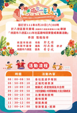 八德區各社區之間感情深厚,為推動多元發展,凝聚社區共識、展現八德情,八德區公所將於8月20日(星期六)上午特於八德藝文廣場天幕,舉行「桃園市八德區111年社區趣味競賽暨成果展」活動,為鼓勵各社區努力參加趣味競賽,公所最後依比賽成績頒發給得獎的前六名社區獎盃及獎金,以茲鼓勵。歡迎市民好朋友們一起來加油。 八德區公所將於8月20日(星期六)上午特於八德藝文廣場天幕,舉行...... [閱讀更多]