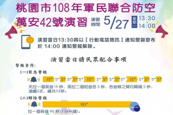 「108年度萬安42號軍民聯合防空演習」宣導。 「108年度萬安42號軍民聯合防空演習」將於5月27日(週一)下午13時30分至14時舉行,在演習期間內,桃園機場捷運系統全線將正常運行,但到站旅客暫時無法離開車站,下車旅客並將由站務人員、捷運警察、保全引導至模擬避難區,實施疏散避難。 桃捷公司指出,為配合「108年度萬安42號軍民聯合防空...... [閱讀更多]