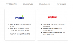 防疫期間,有許多廠商都來送好康了,這當中也不乏各個電信運營商給大家送出免費流量等優惠,這裏小編就給大家整理各大電訊運營商在行動管制期間的各種優惠吧! Maxis 所有的Maxis后付配套用戶將在3月27日起獲得3GB的免費流量,同時在3月27日期能夠獲得Skype、Zoom以及Microsoft Teams的免流量優惠。至於Hotlink預付用戶在每次購買Hotli...... [閱讀更多]
