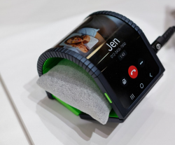 三星展示名為Cling Band的手腕配戴概念裝置,以軟性OLED顯示面板打造同時也展示諸多顯示面板設計