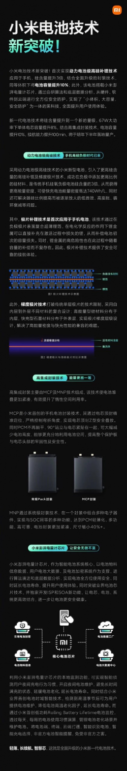 日前分享快充技術發展理念後,小米宣布在手機電池技術有所突破,透過將負極矽含量增加3倍,搭配全面升級的封裝技術,藉此讓相同體積設計的電池容量增加10%,使電力續航時間額外增加100分鐘。 小米表示新電池設計的蓄電密度可達740Wh/L,並且配合小米澎湃電量計算晶片,以更精準演演算法與數據分析確保電力使用安全,並且延長電池使用壽命,避免電池快速老化。 此外,新電池...... [閱讀更多]