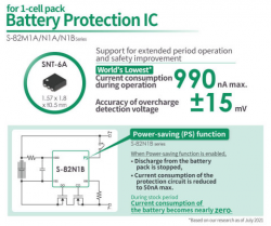 ABLIC 推出 S-82M1A/S-82N1A/S-82N1B 系列單節電池保護 IC ,工作狀態下消耗電流為全球最低 (*1),僅為 990nA (最大值) (*2)