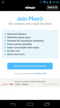 每週流量500MB。一週僅限一部HD影片上傳。如果你想要找某個題材的相關影片卻在Youtube找不到,不妨也可以到Vimeo去搜尋一下,或許就會找到你想要的影片。程式名稱:Vimeo檔案大小:4.1MB下載連結:https://market.android.com/details?id=com.vimeo.android.videoapp程式截圖與簡介:尚未登入前,主程式畫面只有三個功能和搜尋,所...... [閱讀更多]