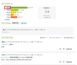 這是網頁版Market的評論頁面,可以看到在星等的部分新增了超連結,而評論也有手機型號及程式的版本,像我當初是在1.2版的時候給予評論的。使用者評論的右邊多了三個篩選器,最左邊是版本,只有所有或者最新版本可以選擇。所有裝置的部分可以改選擇其他曾經登錄過的手機,比方筆者曾經登錄過五種機型。 最右邊是排序依據,可以根據最新、評分或者實用性,因為有的人其實只是不會用就給了個壞評價。如果我要看最新版本、H...... [閱讀更多]