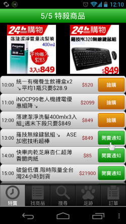 程式名稱:24h購物檔案大小:2.2M下載連結:Android版: https://play.google.com/store/apps/details?id=com.PChome.ShoppingiOS版本:http://itunes.apple.com/us/app/24h-gou-wu/id452668231?mt=8 程式截圖與簡介: PChome 將每日特賣商品放在第一個頁籤。如果還未開...... [閱讀更多]