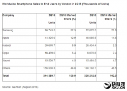 2Q16全球手機排行榜!小米第五、OPPO第四、Apple第二、第一是它!