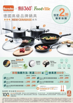 獨家換購全新New Cerabase系列 香港2022年5月25日 /美通社/ -- 優品360°聯乘德國百年高級鍋具品牌Berndes,獨家推出一套5款新登場New Cerabase系列三層不黏塗層廚具,包括煎鍋、單柄湯鍋、高身煎鍋、雙耳湯鍋、炒鑊,於推廣期內,凡換購任何Berndes New Cerabase系列鍋具兩件或以上,更送矽膠鑊鏟及矽膠湯勺一套。追求高品質及精緻鍋具的...... [閱讀更多]