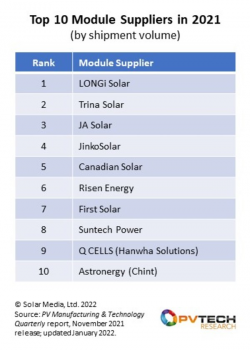 光伏媒體PV-Tech報道:天合光能2021年全球組件出貨排名第二