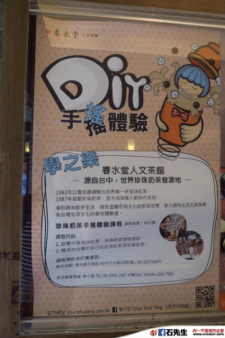 台中的最後一站是「春水堂」。這家春水堂與普通的不同,它提供調茶 DIY 教學的服務,想要學會調配珍珠奶茶,可以來台中的春水堂看看。 春水堂的裝潢以古典為主,有一種老字號的感覺,卻又有一種現代感,對於常喝街頭珍珠奶茶的朋友,試一下也不為過。 課堂的正確名字是「DIY 手搖體驗」,教的是泡沬紅茶、珍珠奶茶之來歷,並有人教導沖調。參與的地方只有一個「春水堂大墩店」,位於台中...... [閱讀更多]