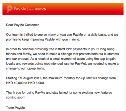 PayMe 又 PlayYou 啦! PayMe 剛剛向用戶發信通知,表示他們將於 2017 年 8 月 1 日調整每月增值(Top-Up)上限,由原來的 HK$10,000 減至 HK$5,000。至於全年限額等等有無變暫時未知,仍然要等 8 月 1 日服務改變後睇條款先知,相關的條款暫時係網頁及手機仍未更新或通知。 這次更改限額除了令大家不能先借未來錢或者套現拿信用卡優...... [閱讀更多]