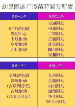 圖說:金門縣公私立幼兒園教育人員施打疫苗時間分配表。(圖片來源:金門縣政府) 〔金門縣新聞〕金門縣政府教育處在金門教育fun學趣臉書發文表示,金門縣幼兒園清冊經教育部審核通過之專案人員,因中央分配給縣市疫苗需等待退冰,送達時間在明(八)日(星期四),等疫苗抵達後,將於十二日(星期一)、十三日(星期二)安排各園前往部立金門醫院施打。 縣府教育處彙集金門縣公私立幼兒園...... [閱讀更多]