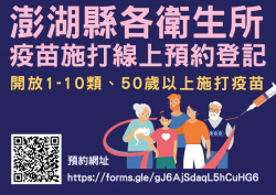 圖說:澎湖全縣11間衛生所即日起接受線上預約接種疫苗(圖片來源:澎湖縣政府) 〔澎湖縣新聞〕澎湖縣政府29日公布,即日起全縣11間衛生所新增線上預約接種疫苗,符合第1至10類對象可利用手機、電腦填具網路表單預約,各衛生所會另行通知施打期程。 澎湖縣政府表示,澎湖開放50歲以上民眾接種疫苗後,各衛生所預約電話經常滿線,為方便民眾預約接種疫苗,且考量各鄉市衛生所醫護人...... [閱讀更多]