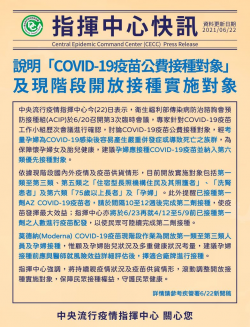 圖說:指揮中心說明「COVID-19疫苗公費接種對象」及現階段開放接種實施對象(圖片來源:衛生福利部 疾病管制署FB) 中央流行疫情指揮中心今(22)日表示,衛生福利部傳染病防治諮詢會預防接種組(ACIP)於6月20日召開第3次臨時會議,專家針對COVID-19疫苗工作小組歷次會議進行確認,討論COVID-19疫苗公費接種對象,經考量孕婦為 COVID-19 感染後容...... [閱讀更多]