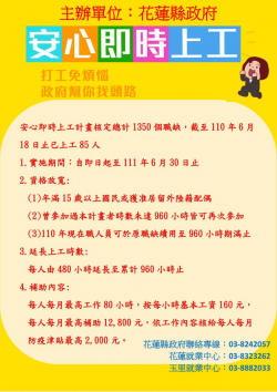 花蓮縣安心即時上工資格放寬 1350個名額提供申請 - TPN 台灣商務新聞網