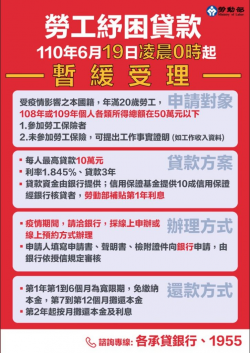 圖說:「勞工紓困貸款」自6月19日凌晨0時起,銀行暫緩受理新申請案。(圖片來源:勞動部) 勞動部表示,為減低疫情對勞工生活之衝擊,自6月15日開辦「勞工紓困貸款」,截至6月18日下午5時止,已有110萬9,552人提出申請,銀行核貸34萬756件,因為申請件數已超過原預定50萬個貸款名額,爰銀行暫緩受理新申請案,待完成核貸作業後,再俟情況滾動檢討。 ...... [閱讀更多]