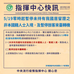 圖說:5月19日零時起暫停未持有我國居留證之非本國籍人士入境,及暫停旅客來臺轉機(圖片來源:疾病管制署 – 1922防疫達人FB) 中央流行疫情指揮中心今(17)日表示,鑒於國際及國內COVID-19疫情升溫,為維護國內防疫安全及確保國人健康,我國自5月19日零時起(當地搭機時間)邊境嚴管措施如下:(一)未持有我國有效居留證之非本國籍人士,暫緩入境。緊急或人道考量等經...... [閱讀更多]