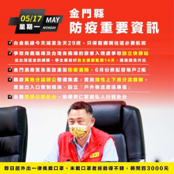圖說:本縣升級疫情防治 今天起外出強制全程戴口罩(圖片來源:金門縣政府) 〔金門縣新聞〕全國新冠疫情升溫,金門縣政府為加強防疫,連日向民眾宣告相關對應舉措,請民眾外出一律戴好口罩,做好健康管理。縣府將在機場旅客入境處設置清潔消毒門、爭取設立快篩站,以共同度過現階段危及健康安全的時刻。 楊鎮浯表示,已經向中央提案爭取在台灣各機場設置快篩站,若中央量能無法配合時,則授...... [閱讀更多]