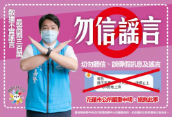 圖說:不明人士惡意散播假訊息企圖中傷 魏嘉賢呼籲勿輕信謠言(圖片來源:花蓮市公所) 〔花蓮縣新聞〕國內疫情嚴峻,正當大家在全力落實防疫措施時,花蓮在地多個LINE群組流傳對花蓮市長魏嘉賢惡意中傷的假訊息,包括宮廟有確診足跡或魏市長宣布停課等。魏嘉賢對此表示,這全部都是「假訊息」,目前他已透過社群網路向大家呼籲勿信謠言之外,也請大家在接收訊息時 一定要先行求證,以免因散...... [閱讀更多]