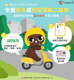 (圖說:騎乘微型電動二輪車3大條件。圖片來源:新北市政府) 坊間常見的電動自行車,經立法院三讀通過《道路交通管理處罰條例》,明確定名為「微型電動二輪車」,且預計自11月30日起,微型電動二輪車需掛牌、投保強制險才能上路;新北市交通局會同消保官、臺北區監理所、財團法人車輛安全審驗中心及警察局辦理聯合稽查,積極督導業者販售審驗合格的車輛、嚴禁改裝,以維民眾騎乘安全。 ...... [閱讀更多]