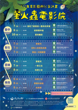最接地氣的螢火蟲電影院今夏再登場!由文化部影視及流行音樂產業局與國立彰化生活美學館合作辦理「112年電影藝術分享計畫—螢火蟲電影院」,精選優質國片播映12場次,深入中臺灣鄉鎮社區及學校,走進在地生活圈,厝邊頭尾相聚看電影,體驗不一樣的觀影經驗。 圖片來源:螢火蟲電影院FB粉絲專頁 螢火蟲電影院將於112年6月28日至112年10月5日,在臺中、南投、彰化、雲林四縣...... [閱讀更多]