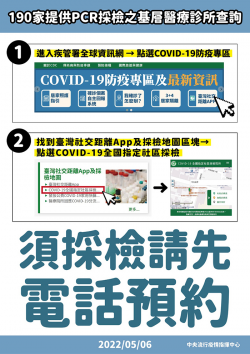 圖片來源:疾管署 中央流行疫情指揮中心今(6)日表示,為避免輕症疑似個案集中於大醫院急診篩檢,造成急診壅塞、影響急重症醫療量能及引發院內感染,指揮中心自2020年建置COVID-19採檢網路,指定199家社區採檢院所,提供有採檢需求之社區民眾前往。由於國內疫情進入社區流行階段,確診個案遽增,為擴大基層醫療防疫量能,強化COVID-19採檢分流,指揮中心開放診所提供PC...... [閱讀更多]