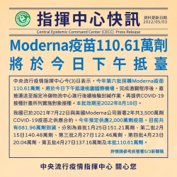 圖片來源:疾管署 中央流行疫情指揮中心今(3)日表示,今(2022)年第六批採購Moderna疫苗110.61萬劑,將於今日下午抵達桃園國際機場,完成通關程序後,直接運送至指定冷儲物流中心進行後續檢驗封緘作業,再提供COVID-19接種計畫所列實施對象接種。本批效期至2022年8月18日。 指揮中心說明,我國已於2021年7月22日與美國Moderna公司簽署2年...... [閱讀更多]