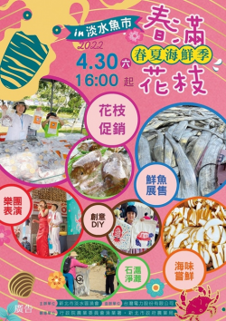 (圖說:2022「春滿花枝季 淡水春夏魚鮮推廣」活動宣傳海報。 圖片來源:新北市政府) 為推廣淡水在地漁產品,淡水區漁會將於4月30日下午4時在漁人碼頭淡水魚市前廣場舉辦「春滿花枝季 淡水春夏魚鮮推廣」活動,行銷春夏當地現撈漁獲,當天現場有最棒的魚鮮美食、趣味的創意手作、石滬淨灘及精彩的樂團表演等,活動內容相當豐富,歡迎大小朋友這個周末來漁人碼頭「品鮮愛海」,珍...... [閱讀更多]