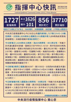 (圖說:今日新增1727例確診病例,分別為1626例本土個案及 101例境外移入。圖片來源:衛生福利部疾病管制署) 中央流行疫情指揮中心今(19)日公布國內新增1,727例COVID-19確定病例,分別為1,626例本土個案及101例境外移入(89例為航班落地採檢陽性);另確診個案中新增2例死亡。 指揮中心表示,今日新增之1,626例本土病例,為825例男性...... [閱讀更多]