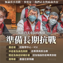 (圖說:臺北市新增案例多,臺北市政府決定將改變政策與病毒共存,有症狀趕快快篩。 圖片來源:台北市市長柯文哲臉書粉絲專頁) 臺北市政府衛生局表示,截至今(7)日中午12時,臺北市新增87例本土病例,58例新增確診病例疫調中,29例為已知感染源或相關聯個案,其中按摩會館相關1例(中正區案25367),百貨公司特展2例(大安區案25526、文山區25375),某餐飲店...... [閱讀更多]