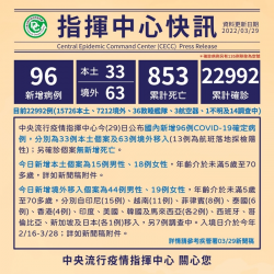 (圖說:今日國內新增96例新冠肺炎確定病例。圖片來源:衛生福利部疾病管制署) 中央流行疫情指揮中心今(29)日公布國內新增96例COVID-19確定病例,分別為33例本土個案及63例境外移入(13例為航班落地採檢陽性);另確診個案無新增死亡。指揮中心表示,今日新增本土個案為15例男性、18例女性,年齡介於未滿5歲至70多歲。 指揮中心說明,今日新增境外移入個案為4...... [閱讀更多]