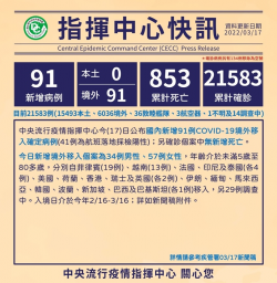 中央流行疫情指揮中心今(17)日公布國內新增91例COVID-19境外移入確定病例(41例為航班落地採檢陽性);另確診個案中無新增死亡。 (圖片來源:衛生福利部疾病管制署) 指揮中心說明,今日新增境外移入個案為34例男性、57例女性,年齡介於未滿5歲至80多歲,分別自菲律賓(19例)、越南(13例)、法國、印尼及泰國(各4例)、美國、荷蘭、香港、瑞士及英國(各2例...... [閱讀更多]