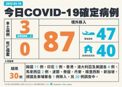 (圖說:今日確診病例共90例,分別為本土個案3例以及境外移入87例。圖片來源:流行疫情指揮中心) 中央流行疫情指揮中心今(16)日公布國內新增90例COVID-19確定病例,分別為3例本土個案及87例境外移入(47例為航班落地採檢陽性);另確診個案無新增死亡。指揮中心表示,今日新增本土個案為1例男性,2例女性,年齡介於10多歲及70多歲。 指揮中心說明,今日新增境...... [閱讀更多]
