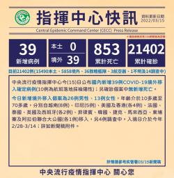 中央流行疫情指揮中心今(15)日公布國內新增39例COVID-19境外移入確定病例(10例為航班落地採檢陽性);另確診個案中無新增死亡。 (圖說:今日新增39例,皆為境外移入。圖片來源:衛生福利部疾病管制署) 指揮中心說明,今日新增境外移入個案為26例男性、13例女性,年齡介於10多歲至70多歲,分別自越南(8例)、印尼(5例)、美國及香港(各4例)、法國、泰國、...... [閱讀更多]