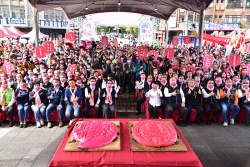 圖說:盧市長、中央客委會鍾副主委孔炤、市府團隊及來賓於120斤龜粄及桃粄前合影 (圖片來源:台中市政府) 2022台中東勢新丁粄節15日「正月半」在東勢客家文化園區登場,包含鬪粄、踩街靚客行、擲炮城等多項精采節目,發揚優良客家傳統文化。市長盧秀燕出席表示,新丁粄節是她最喜歡的台中節慶之一,今年有龜粄及桃粄,象徵生男育女都幸福,也祝福大家元宵節快樂,虎年行大運。 盧...... [閱讀更多]
