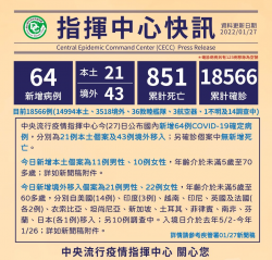 1/27新增64例COVID-19確定病例,分別為21例本土及43例境外移入 - TPN 台灣商務新聞網