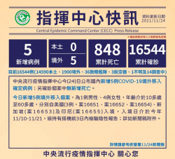 (圖片來源:疾管署) 中央流行疫情指揮中心今(24)日公布國內新增5例COVID-19境外移入確定病例;另確診個案中無新增死亡。 指揮中心說明,今日新增5例境外移入個案,為1例男性、4例女性,年齡介於10多歲至60多歲,分別自美國(3例,案16651、案16652、案16654)、新加坡(案16653)及印尼(案16655)入境,入境日介於今(2021)年11月1...... [閱讀更多]