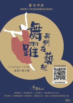 圖片來源:南投縣政府 南投縣政府文化局「藝起同樂-南投縣110年度表演藝術巡迴演出」埔里場,由本縣傑出演藝團隊-「薪傳舞蹈團」於110年11月27日(星期六)19:30南投埔里仁愛公園,為大家帶來「舞躍我們在藝起」一系列精彩絕倫的舞蹈表演。「薪傳舞蹈團」為南投縣埔里在地的舞蹈團隊,由團長林幸弘老師一手創辦,並以培育優秀新生代舞者,推廣舞蹈藝術為宗旨。埔里向來有豐富的自...... [閱讀更多]