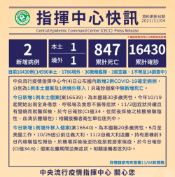 (圖片來源:疾管署) 中央流行疫情指揮中心今(4)日公布國內新增2例COVID-19確定病例,分別為1例本土個案及1例境外移入;另確診個案中無新增死亡。 指揮中心說明,今日新增1例本土個案(案16539),為本國籍30多歲男性,今(2021)年10月19日起開始出現全身倦怠、呼吸喘及食慾不振等症狀,11月2日因症狀持續且有發燒而就醫採檢,於今日確診(Ct值34,住...... [閱讀更多]